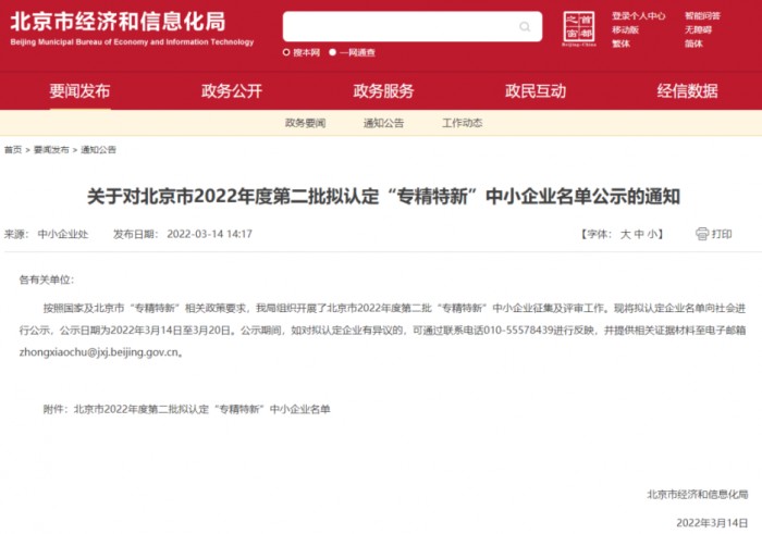 北京市2022年度第二批拟认定“专精特新”中小企业名单